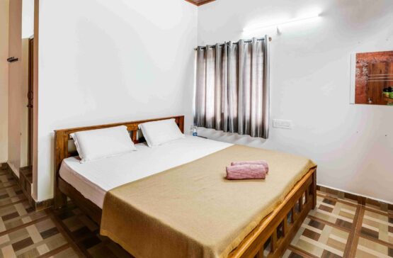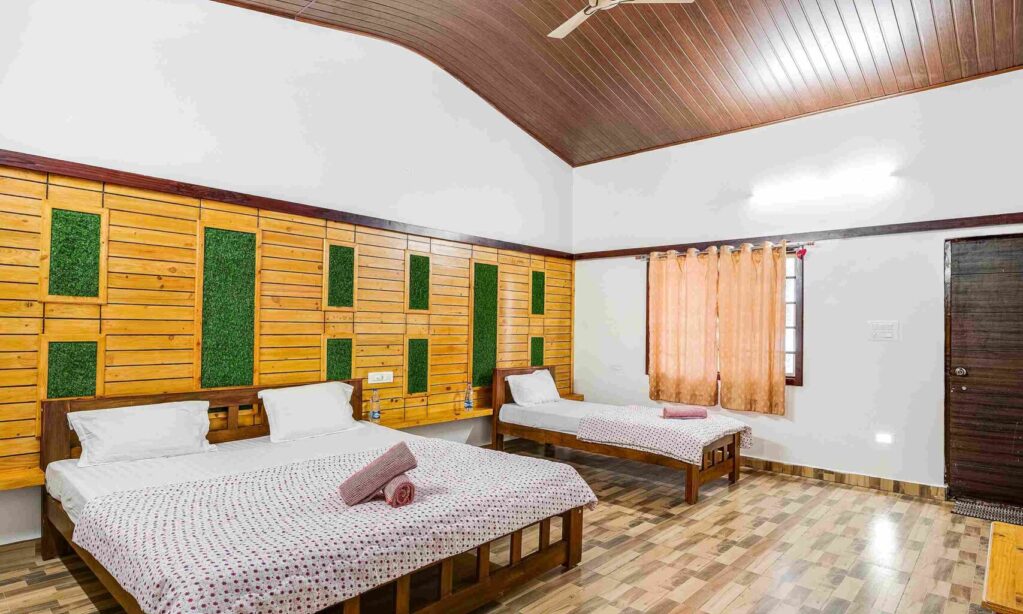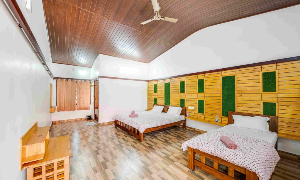 Our spacious Family Room features a king-size bed, a single bed, air conditioning and an attached toilet with 24/7 hot water, accommodating up to three guests with an extra bed option for a fourth guest. Enjoy a private porch overlooking the pool and lush garden, perfect for a relaxing stay.